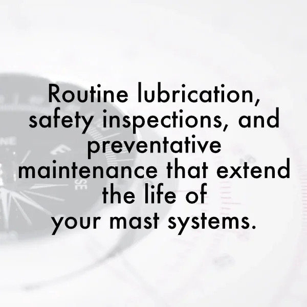 Keep your mast systems performing reliably with Compass Self-Service Kits. Each kit includes lubrication materials, seals, replacement parts, and clear instructions that make routine maintenance quick and consistent.